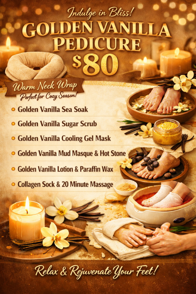 Welcome to our exceptional pedicure services, where we combine meticulous nail care with luxurious treatments to pamper and rejuvenate your feet. Our basic pedicure begins with a thorough cleaning, precise cuticle care, expert nail shaping, and a flawless polish application, ensuring your feet look and feel their best. For an elevated experience, indulge in our upgraded pedicure featuring a range of deluxe treatments. Immerse yourself in relaxation with a warm paraffin wax treatment, designed to moisturize and soften your skin deeply. Feel tension dissolve as hot stones and warm towels are used to massage your feet, promoting circulation and easing muscle strain. Our collagen-infused products nourish and hydrate, making your skin smooth and revitalized. Experience the refreshing coolness of a cucumber wrap, known for its soothing benefits, followed by a comforting neck wrap to enhance overall relaxation. For the ultimate indulgence, try our special Volcano CBD pedicure. This unique treatment includes a 30-minute massage using CBD-infused products, known for their calming and anti-inflammatory properties. It’s a perfect way to unwind and treat your feet to a luxurious spa experience. Discover the perfect pedicure for you today, where each service is designed to beautify your feet and provide a blissful escape from the everyday hustle and bustle.